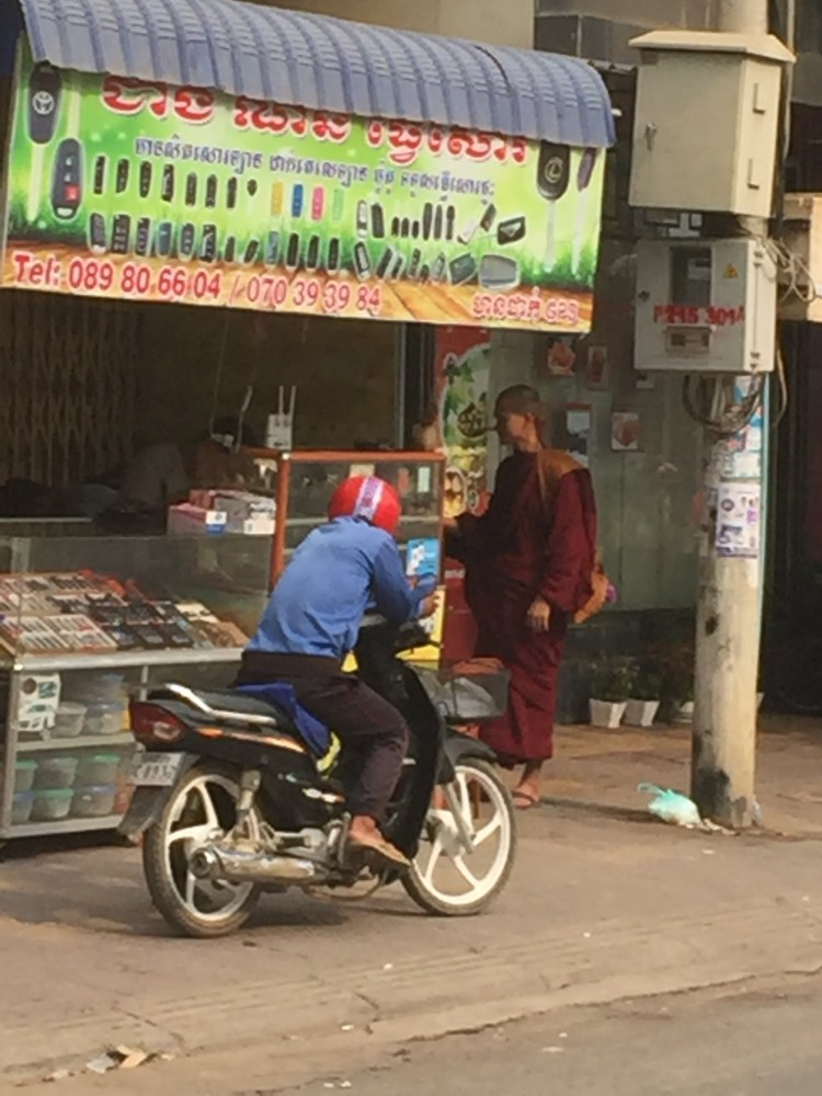 (Buddhist monk receives his morning alms donation of food – on the street in Battambang)