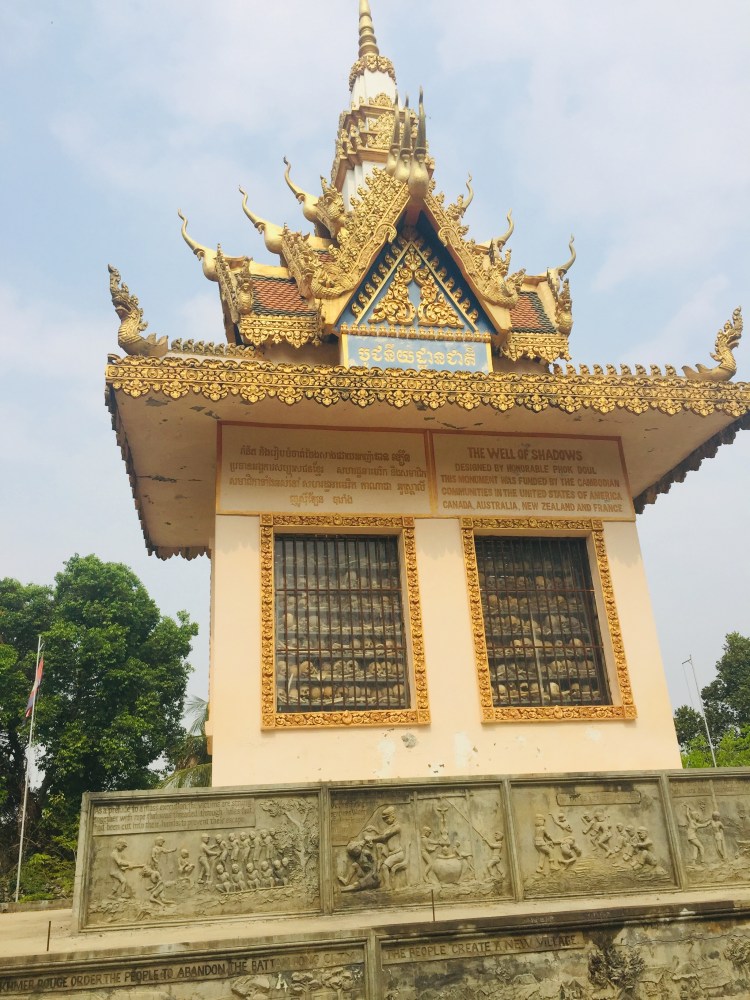 (Memorial at Wat Somprong. The stupa is filled with bones from the mass graves unearthed here. The inscription on the panel above reads ” If we keep you it is no gain, if we kill you it is no gain”)
