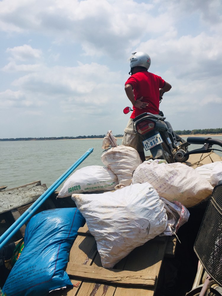 Kratie itself didn’t take long to explore. The dusty streets yielded a small fruit/vegetable/meat market and a pagoda. Soon I headed to the riverbank to catch a ferry (think small old wooden boat) to Koh Trong Island. Soon I was headed up Koh Trong’s sandy shores with the 25 other ferry customers (plus a motorbike and several large sacks of rice).