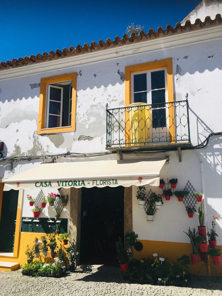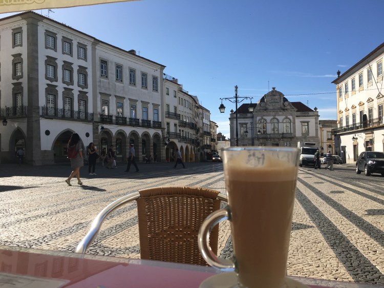 (Top: View of Evora’s Giraldo Square over my morning latte; Bottom: White and yellow dominate the streets)